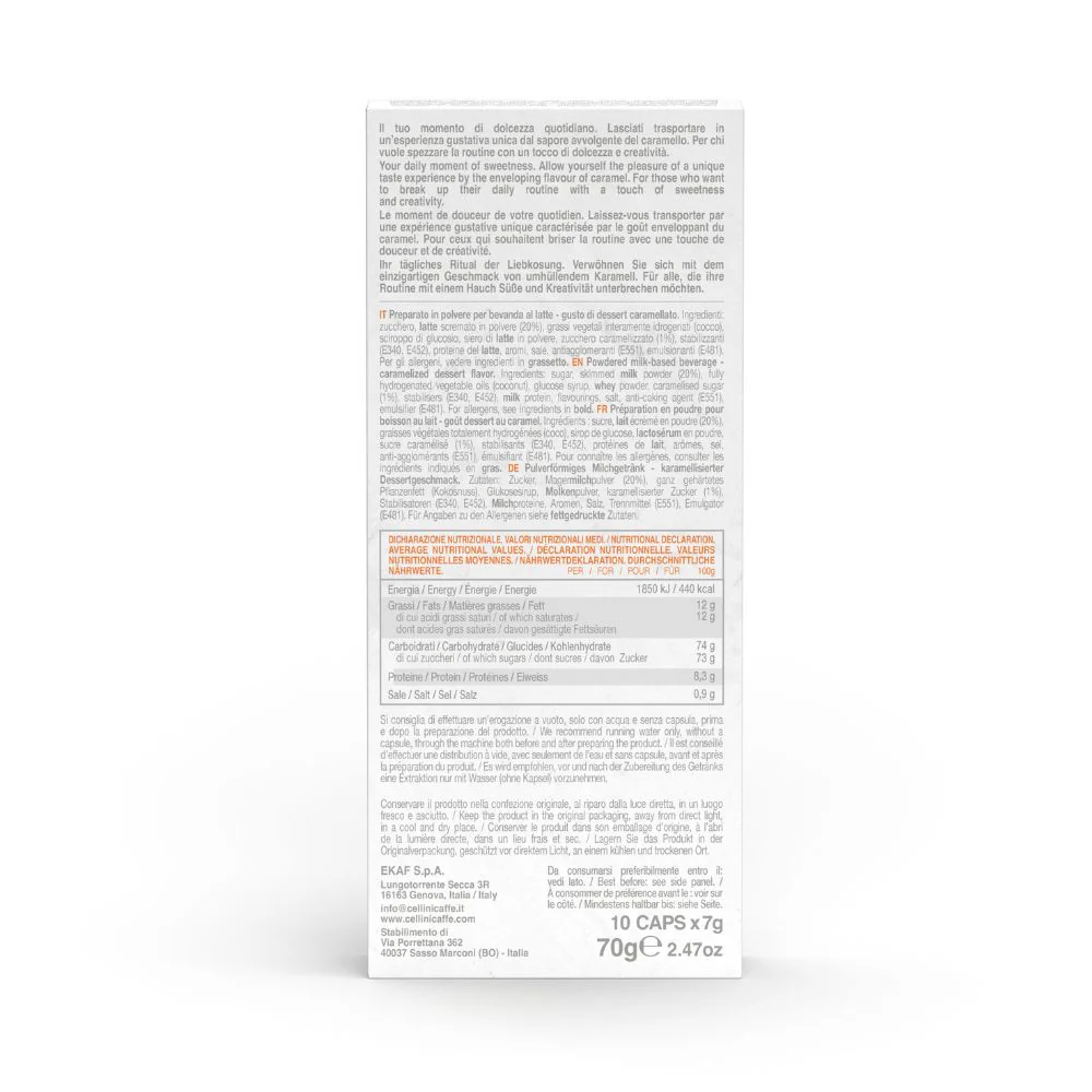 La nostra Crema Catalana in capsule, caratterizzata da un piacevole retrogusto di caramello, è l’ideale per gli amanti del celebre dessert! Crema Catalana (gusto dessert caramellato). Può contenere derivati del latte, tracce di glutine, uova, frutta a guscio e soia.